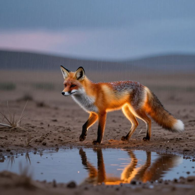 Glowing fox strides through a desolate desert landscape, its luminous fur reflecting off a shallow pool of water beneath, while rain cascades softly behind its back against a twilight sky.