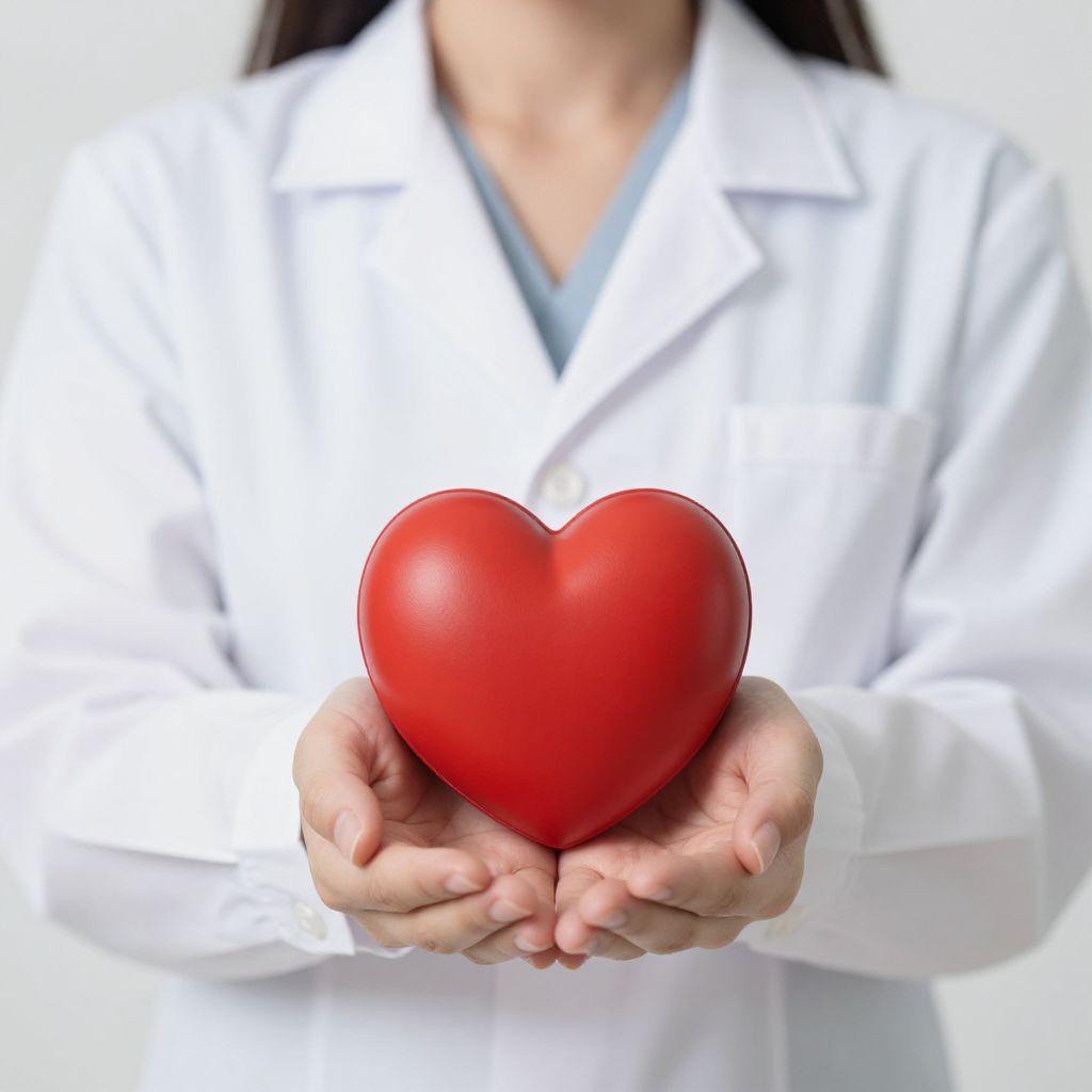 Woman in a white lab coat holding a vibrant red heart-shaped object in her cupped hands, symbolizing healthcare and cardiology concepts.