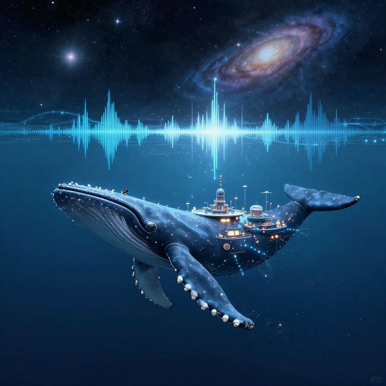 A floating city anchored to a whale’s back drifts through visible sound waves, setting its course by the harmonies of distant galaxies.