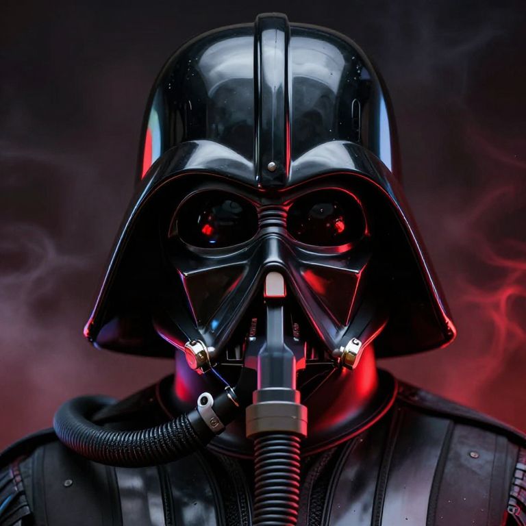 Photorealistic digital art of Darth Vader in black armor with glowing red eyes, gas mask, and dark background with red smoke.