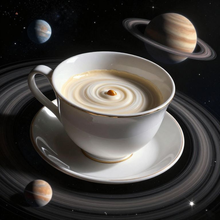 A labyrinthine staircase spirals infinitely upward inside a floating teacup, with miniature astronomers mapping the stars brewed within.
