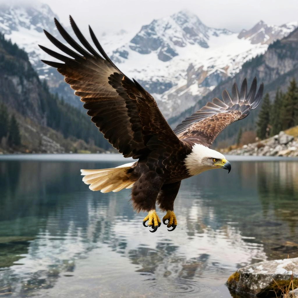 Eagle mid-flight over a crystal-clear mountain lake reflecting snowy peaks, wings fully extended showing detailed feather patterns, vivid colors with dynamic lighting and a sense of freedom and wilderness.