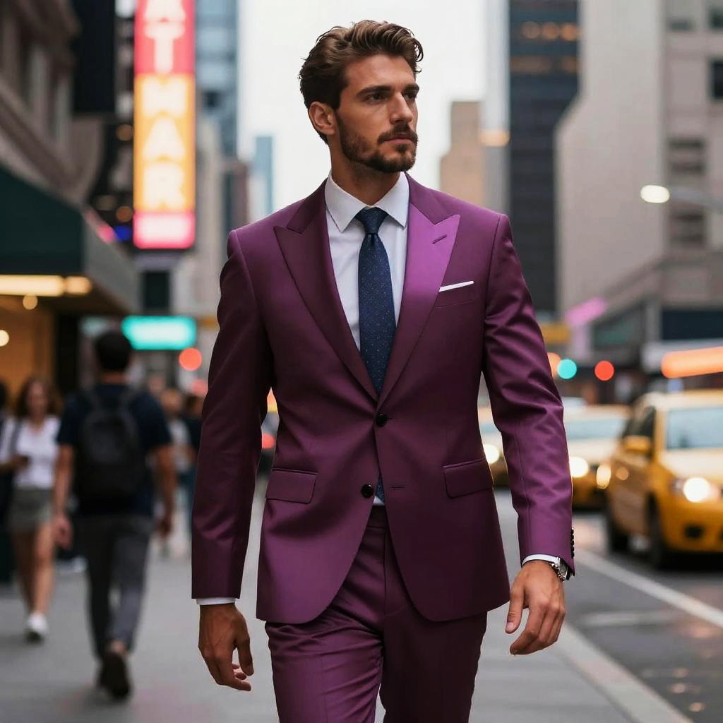 Snazzy suit worn by a confident man standing in a bustling city street at dusk, neon lights reflecting off the fabric, tailored fit with a modern twist, sharp lapels, vibrant color palette emphasizing elegance and style, cinematic lighting, urban fashion vibe.