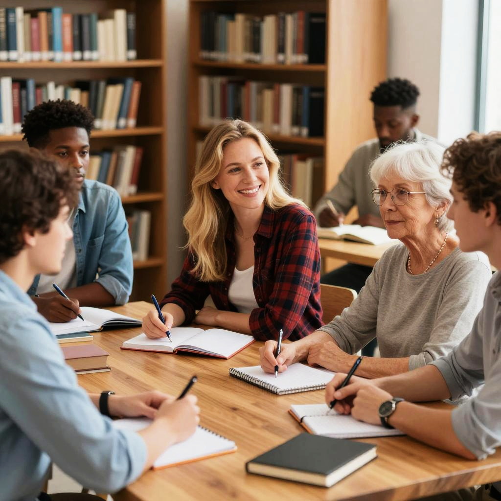 Photograph of a diverse group of six people, four men and two women, sitting around a wooden table in a well-lit library. The central blonde woman in a red plaid shirt is leaning forward, smiling, while an older woman with short white hair looks on. Everyone is engaged, with notebooks and pens in front of them. Shelves of books fill the background.