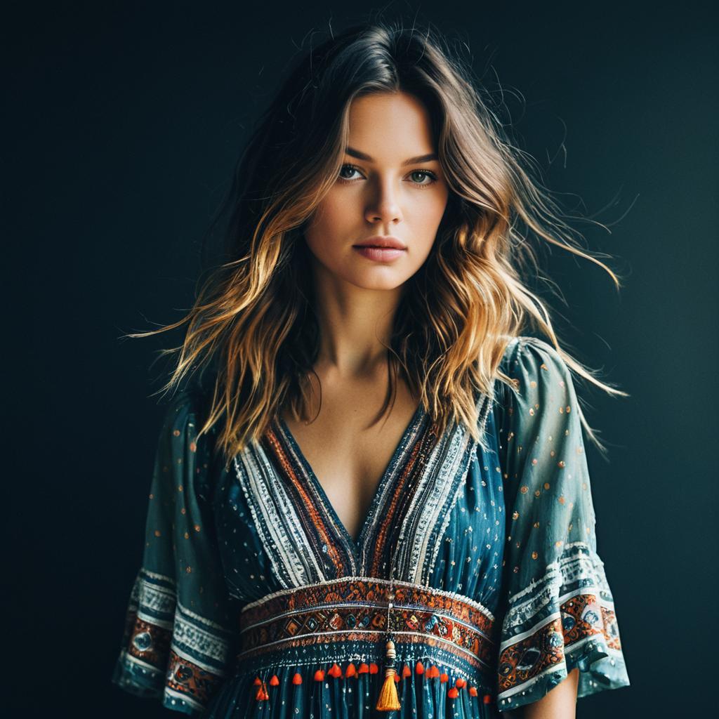 Female Model with Layered Fade Hairstyle in Bohemian Dress