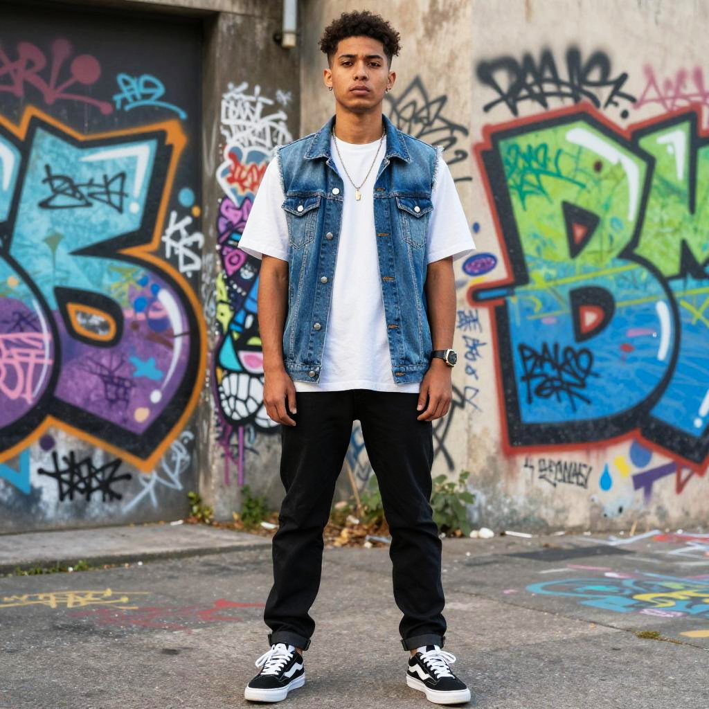 A young man stands confidently in a vibrant urban setting, showcasing a stylish outfit that blends modern streetwear with artistic flair. The graffiti-covered walls create a colorful backdrop, emphasizing the creativity and energy of the environment, perfect for those seeking inspiration in street culture.