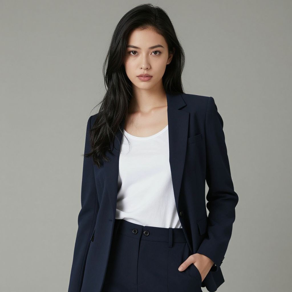 "party trouser suits woman, 1girl, solo, black hair, realistic, long hair, jacket, lips, brown eyes, hand in pocket, looking at viewer, pants Realistic photo of casual sexy person with pretty face"