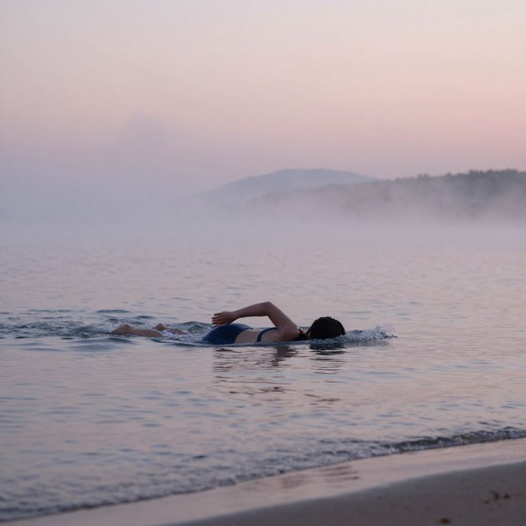 Photograph of a person swimming in calm, misty water at dawn, with pastel pink and purple sky, and distant foggy shoreline.