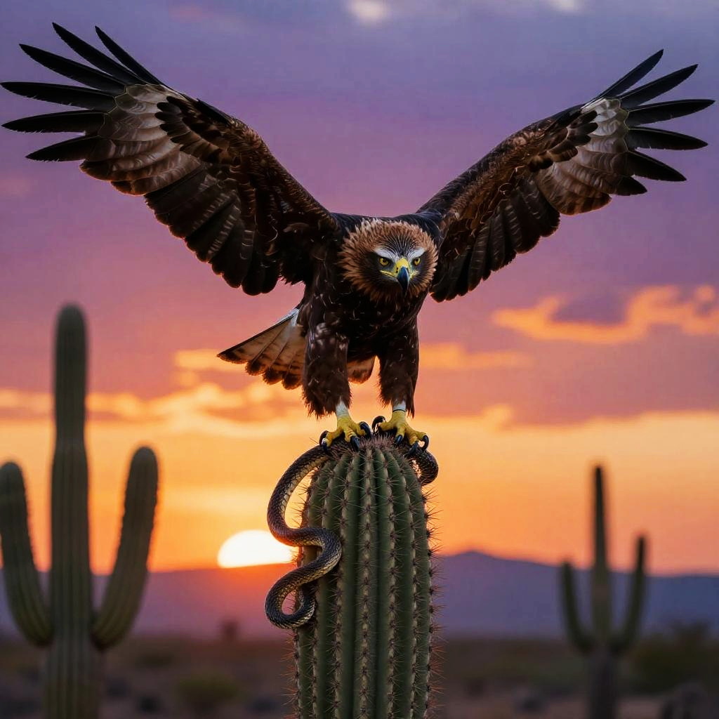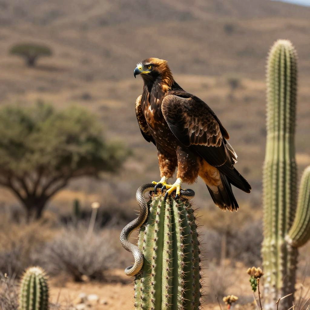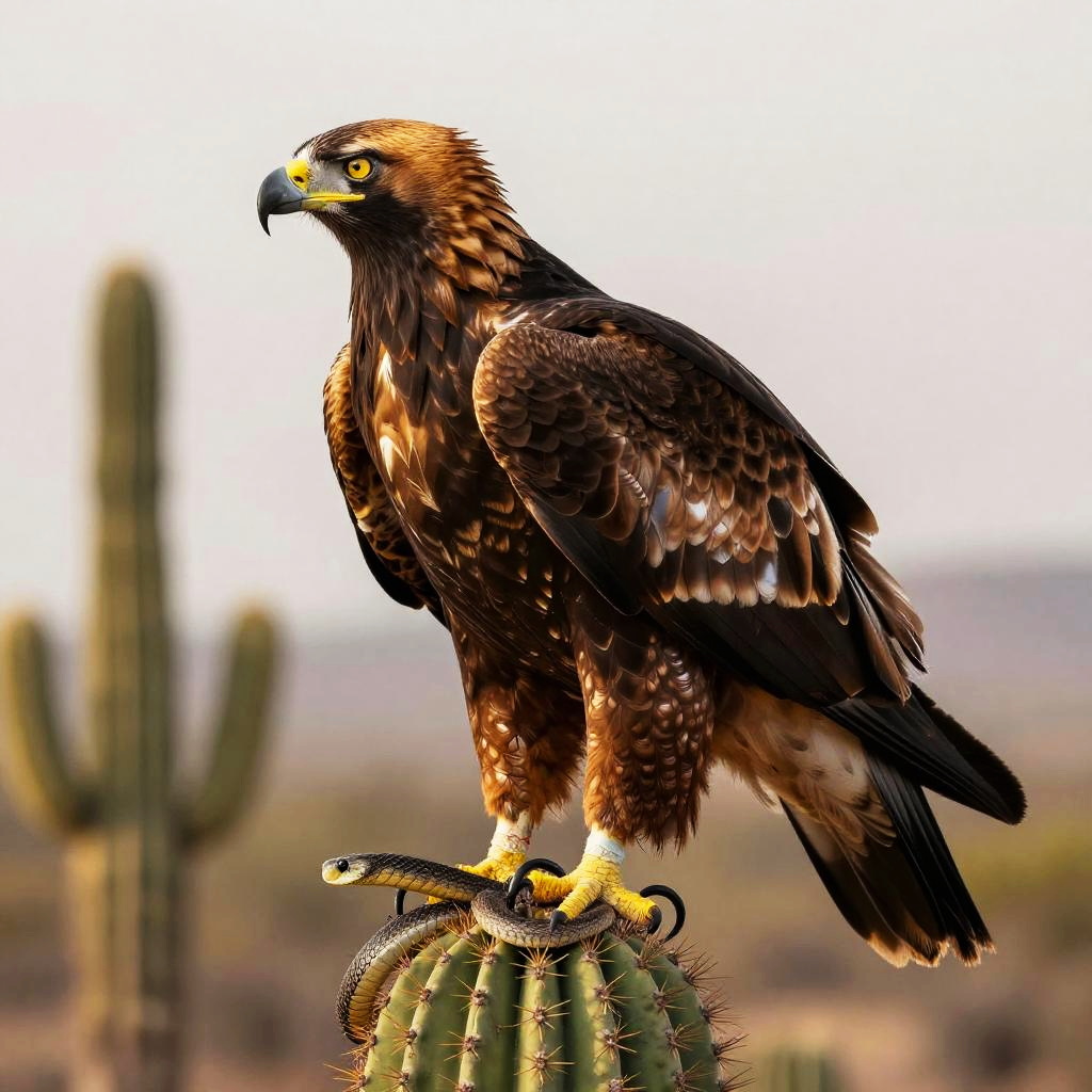 Majestic eagle on cactus with snake in Mexican desert, intricate textures on feathers and scales, warm golden light, dynamic composition, hyper-realistic nature scene