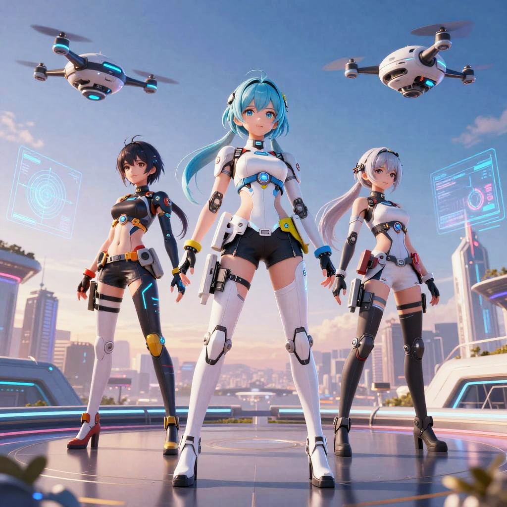 Female anime video game characters with futuristic tech gear, hovering drones and holograms, sci-fi city skyline at sunset, sleek designs, luminous accents, crisp clean lines and vibrant colors