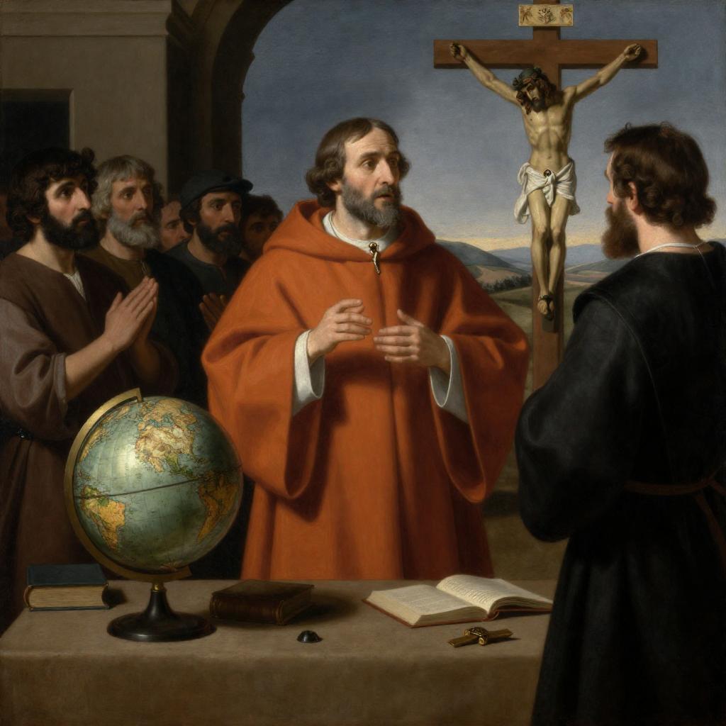 A painting depicts a middle-aged man in an orange robe standing at a table with a globe, books, and a crucifix, addressing a crowd of people in historical clothing. In the background, a crucifixion scene is visible. The man is speaking to another man in dark clothing on the right.