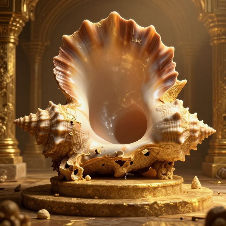 This digital CGI artwork depicts a large, ornate, golden scallop shell with intricate carvings, glowing warmly from an internal light source. The shell is positioned on a circular, intricately designed pedestal in a grand, ancient-looking room with arched, gold-accented columns. Surrounding the pedestal are scattered seashells and small pebbles. The background is dimly lit, highlighting the radiant shell. The texture of the shell is detailed with ridges and patterns, giving it a lifelike appearance despite the fantastical setting. The overall style is highly detailed and realistic, with a magical, almost otherworldly ambiance.
