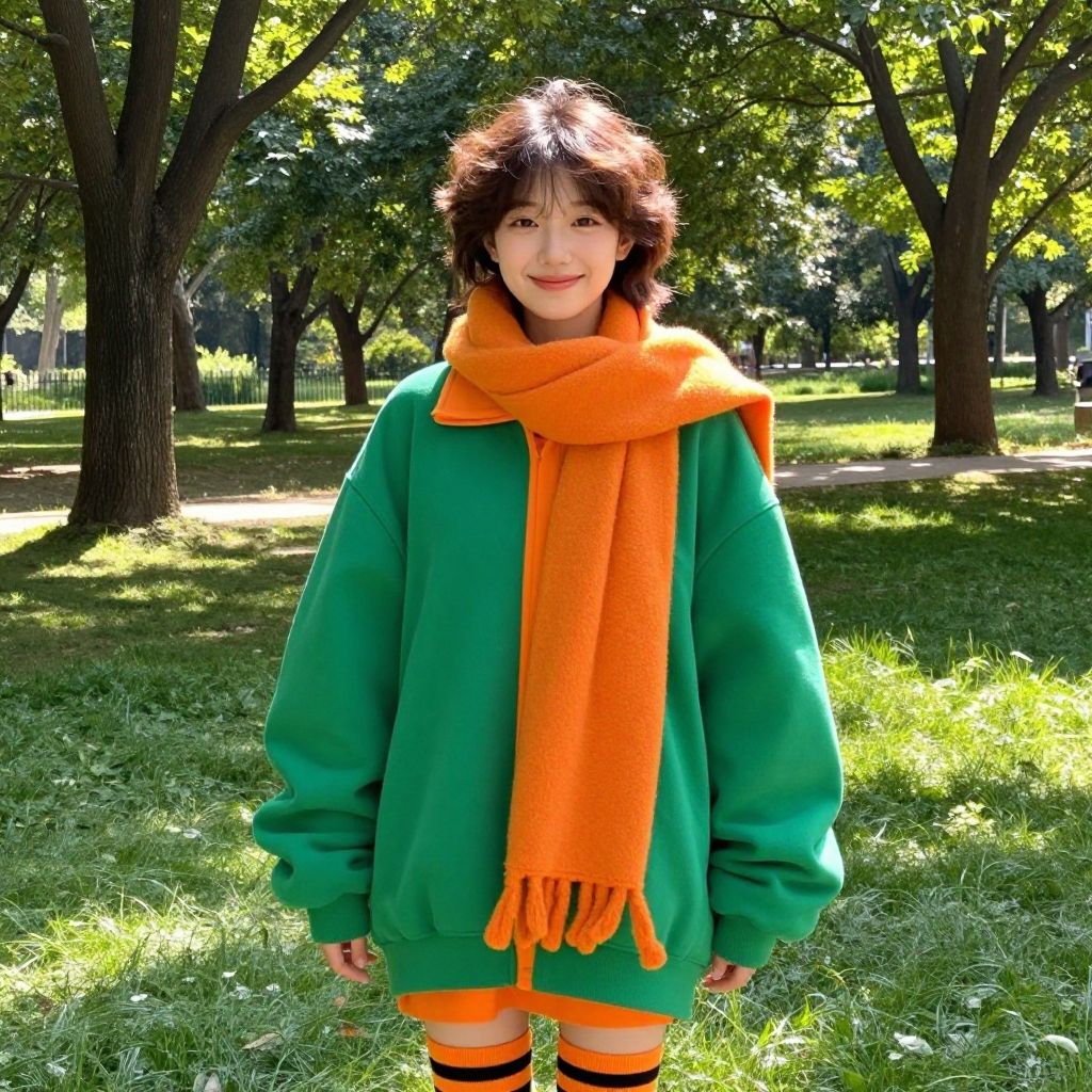A young adult, in their late teens to early twenties, stands in a sunny park, wearing a vibrant green and orange outfit with a cozy oversized jacket and a bright orange scarf, paired with orange and black striped socks. They have natural, slightly wavy brown hair, soft features, and a warm, friendly smile directed at the camera, exuding approachability and joy. The background features a lush green landscape with tall trees, soft sunlight filtering through the leaves, creating dappled patterns on the ground and a cheerful, lively atmosphere. The scene is bright and inviting, with a gentle breeze suggesting movement in the grass and trees, enhancing the sense of calm and outdoor tranquility.