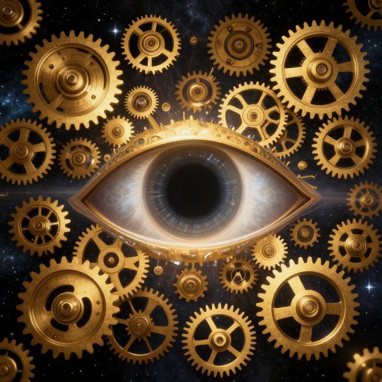 A celestial tapestry of golden gears and cogs orbits a mesmerizing, eye-shaped void, defying gravity and logic in a cosmic dance that blurs the boundaries between machinery and the cosmos.