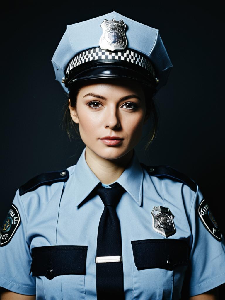 Woman in Police Costume, photorealistic detailed studio portrait
