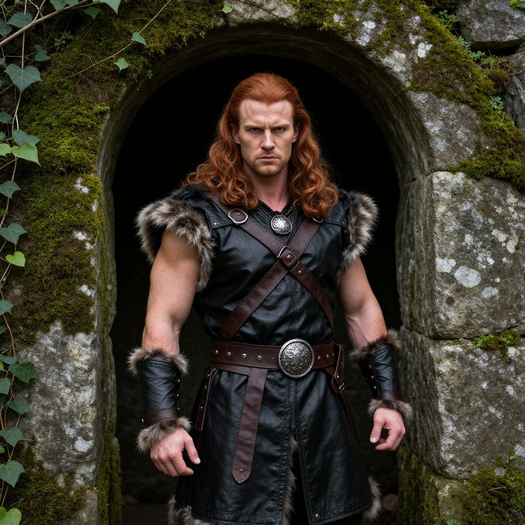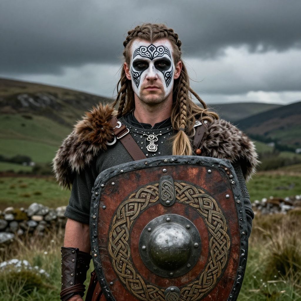 Portrait of a Scottish warrior with braided hair and intricate face paint, holding a shield adorned with Celtic knots, set against a backdrop of rolling green hills and a stormy sky