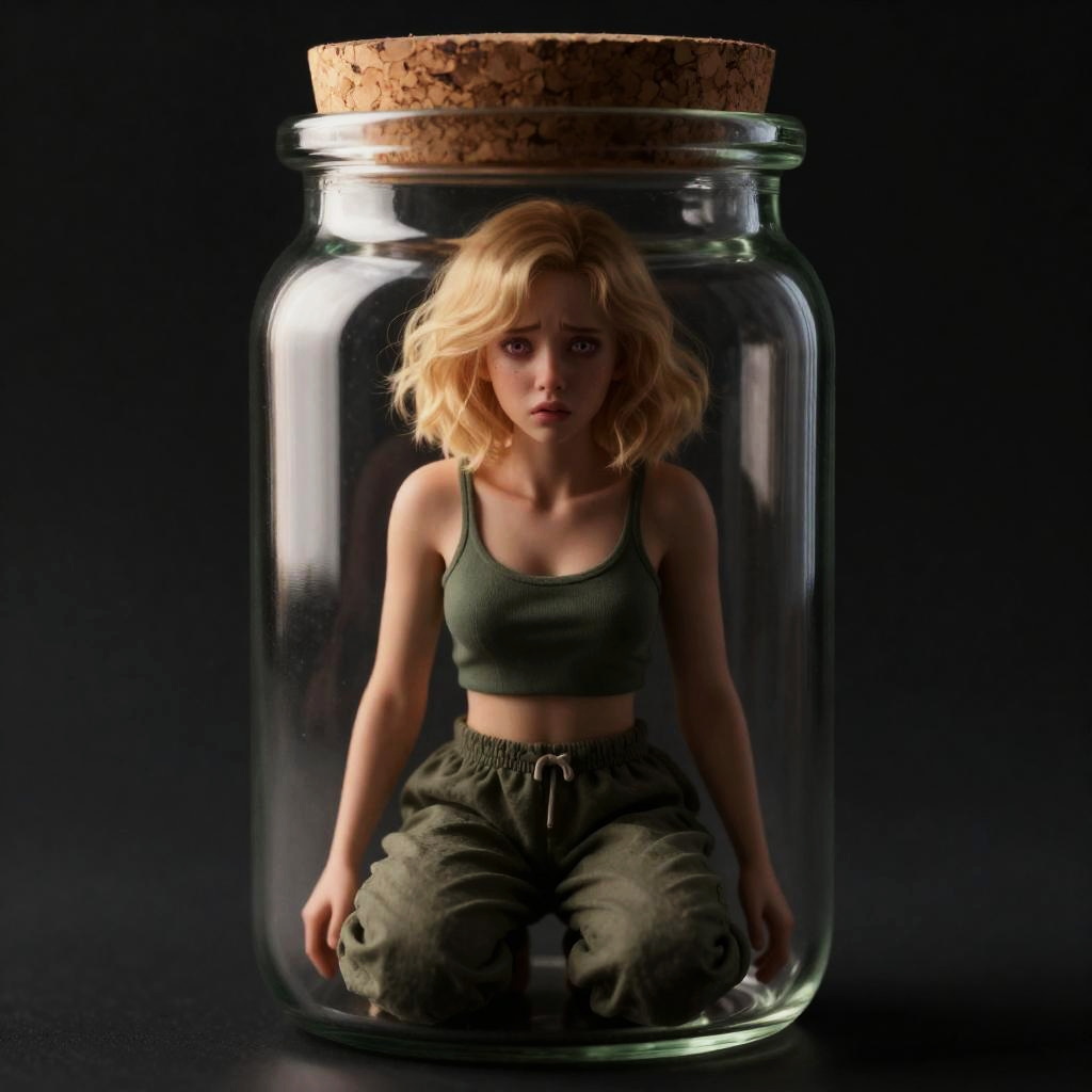 Shrunken Girl Trapped in Glass Jar