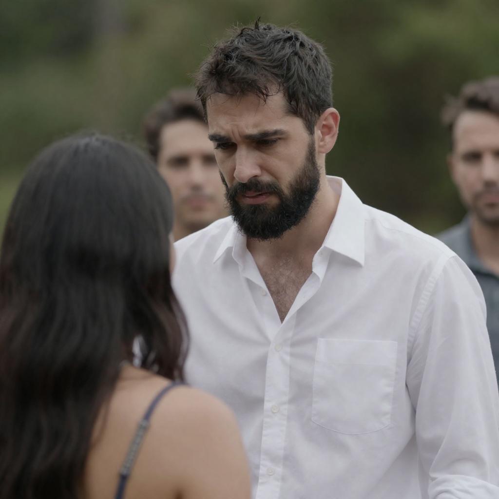 Photograph of a bald, bearded man with intense gaze, wearing a black shirt, facing another person with long hair. Nighttime setting, dim lighting, blurry background with people and vehicles. Man's expression focused, slightly serious. Multiple light sources in background.