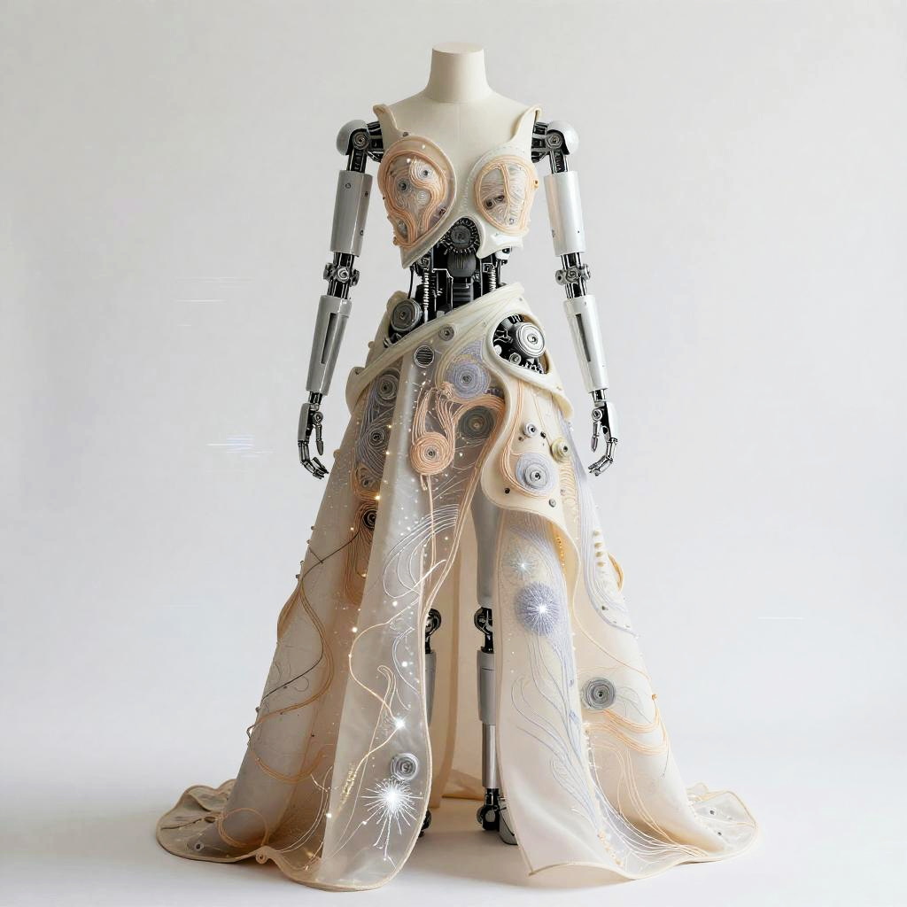 Dress AI fusion, avant-garde couture combining organic materials with robotic elements, intricate mechanical embroidery and luminescent threads, presented on a minimalistic white background with subtle digital glitch effects, hyper-realistic style with soft shadows and reflections