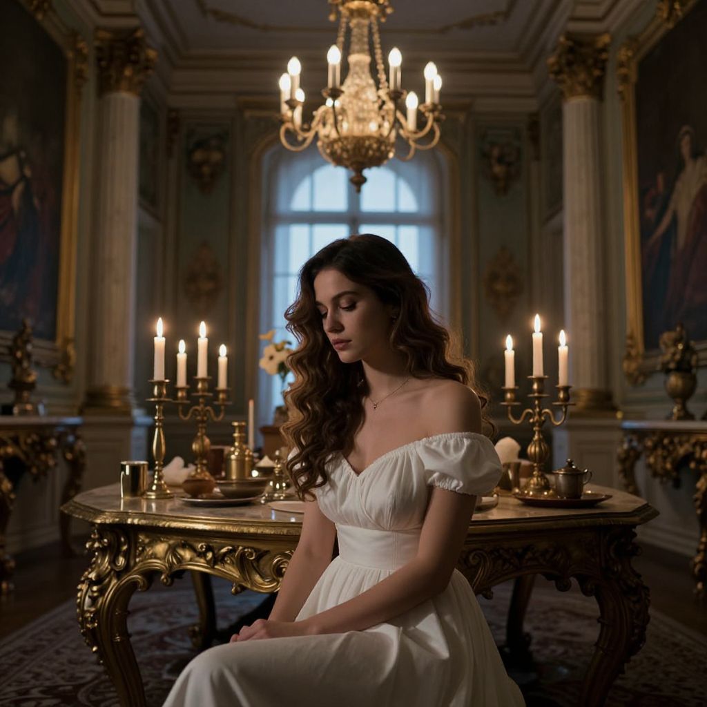 In a dimly lit, opulent room, a woman with long, wavy hair is seated, her gaze directed downward. She wears a white, off-the-shoulder dress that accentuates her delicate features. The room is adorned with ornate columns, a chandelier hanging from the ceiling, and a large, ornate table covered with various objects. Candles flicker on candlesticks, casting a warm glow that contrasts with the cool blue light filtering through the windows. The walls are adorned with intricate paintings, adding to the room's grandeur. The overall atmosphere is one of mystery and elegance, with the woman's serene expression adding a touch of tranquility to the scene.