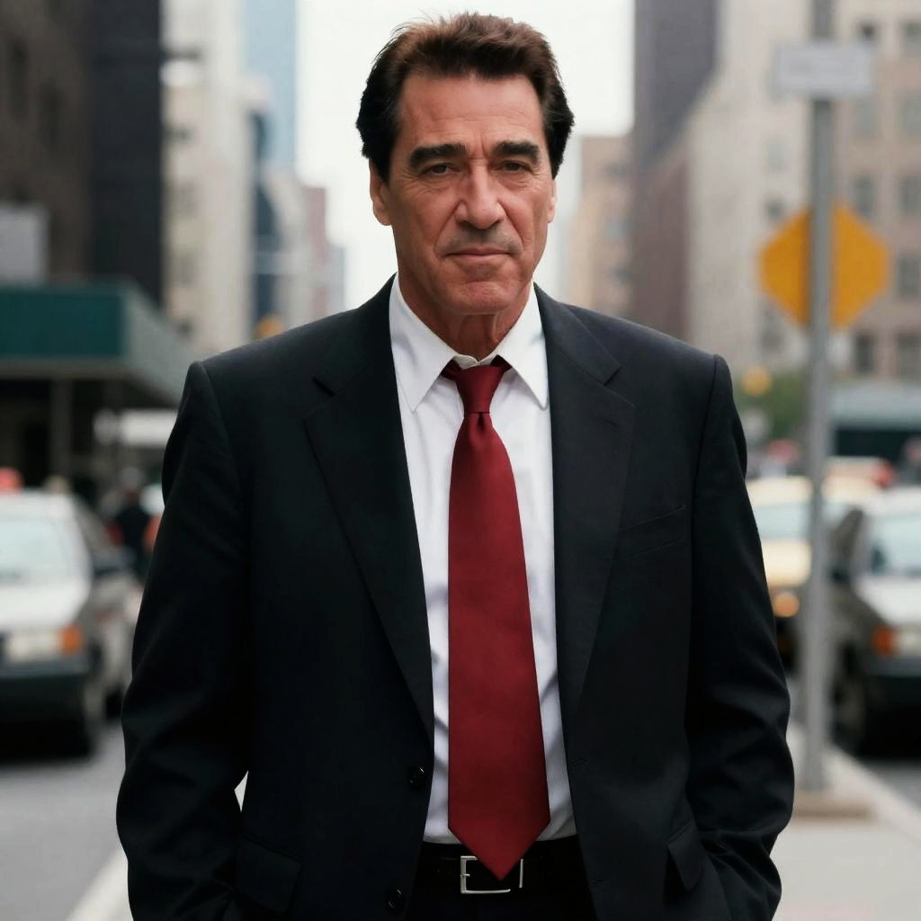 Photograph of an older man with short, dark, slightly graying hair, wearing a black suit, white dress shirt, and red tie. He stands in an urban street setting with blurred background of buildings and cars. His expression is serious, and he is positioned centrally in the frame. The street has yellow road signs and traffic, with a mix of modern and older buildings. The lighting is natural, suggesting daytime. The image has a slightly overexposed effect, making the background blurry and the man's features more prominent.