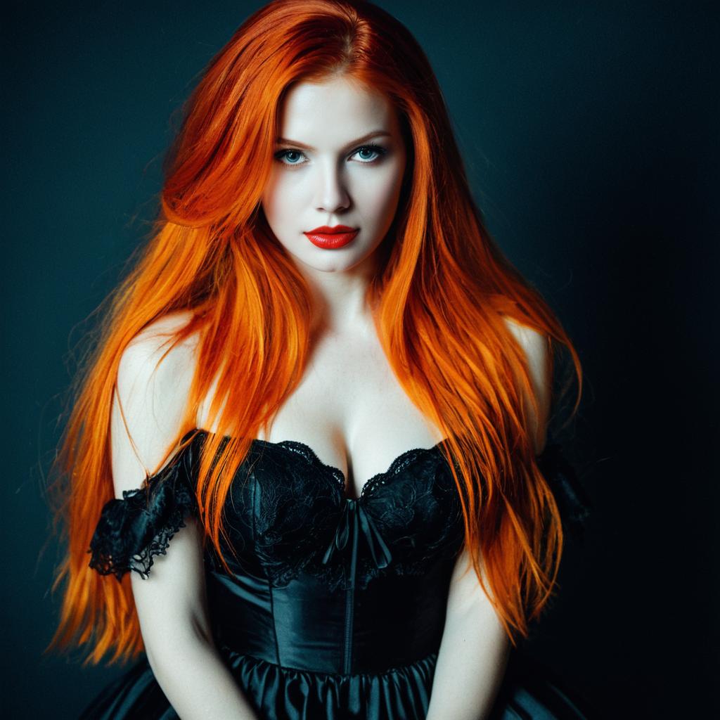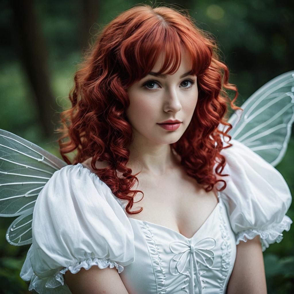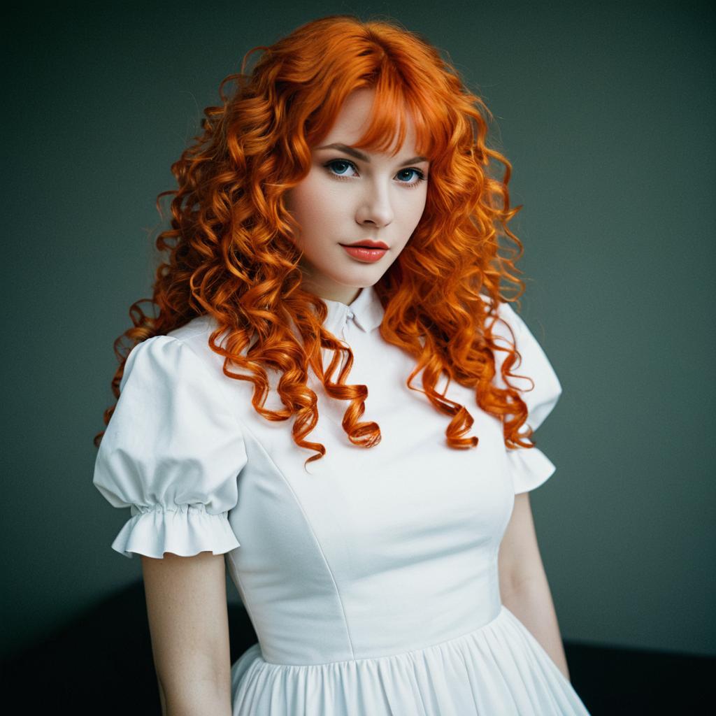 Portrait of a young woman with long, vibrant curly red hair wearing a fitted white dress with short puffed sleeves. She has fair skin, blue eyes, and red lips, looking directly at the camera with a neutral expression. The background is a plain muted gray.