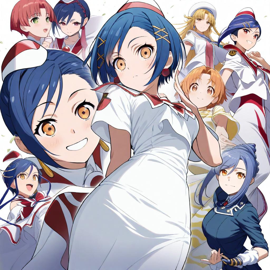 Aika granzchesta, aria (manga), 1girl, yellow eyes, brown eyes, blue hair, short hair, himeya company uniform, uniform, himeya company uniform, uniform, white dress, long dress, hat, earrings, by artist omaru gyuunyuu, animagine