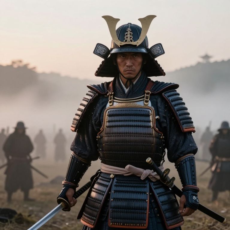 Dominance captured by an ancient samurai in full armor standing firmly on a mist-covered battlefield at dawn, intense expression with piercing eyes, traditional katana held firmly, soft warm light breaking through fog, highly detailed historical scene