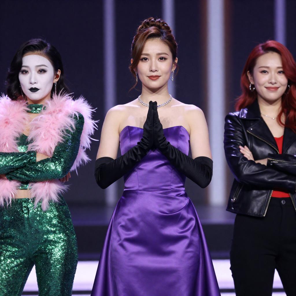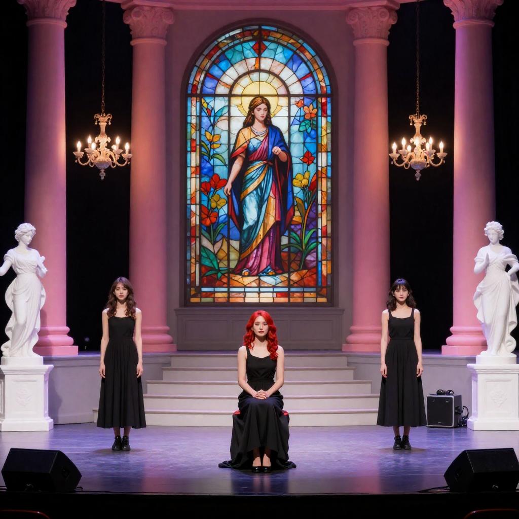 Theater stage with pink columns, white statues on either side, three women: one seated in front with red hair, one standing in black dress on left, one in black dress on right. Vibrant stained glass backdrop, chandeliers, steps, and scattered equipment.