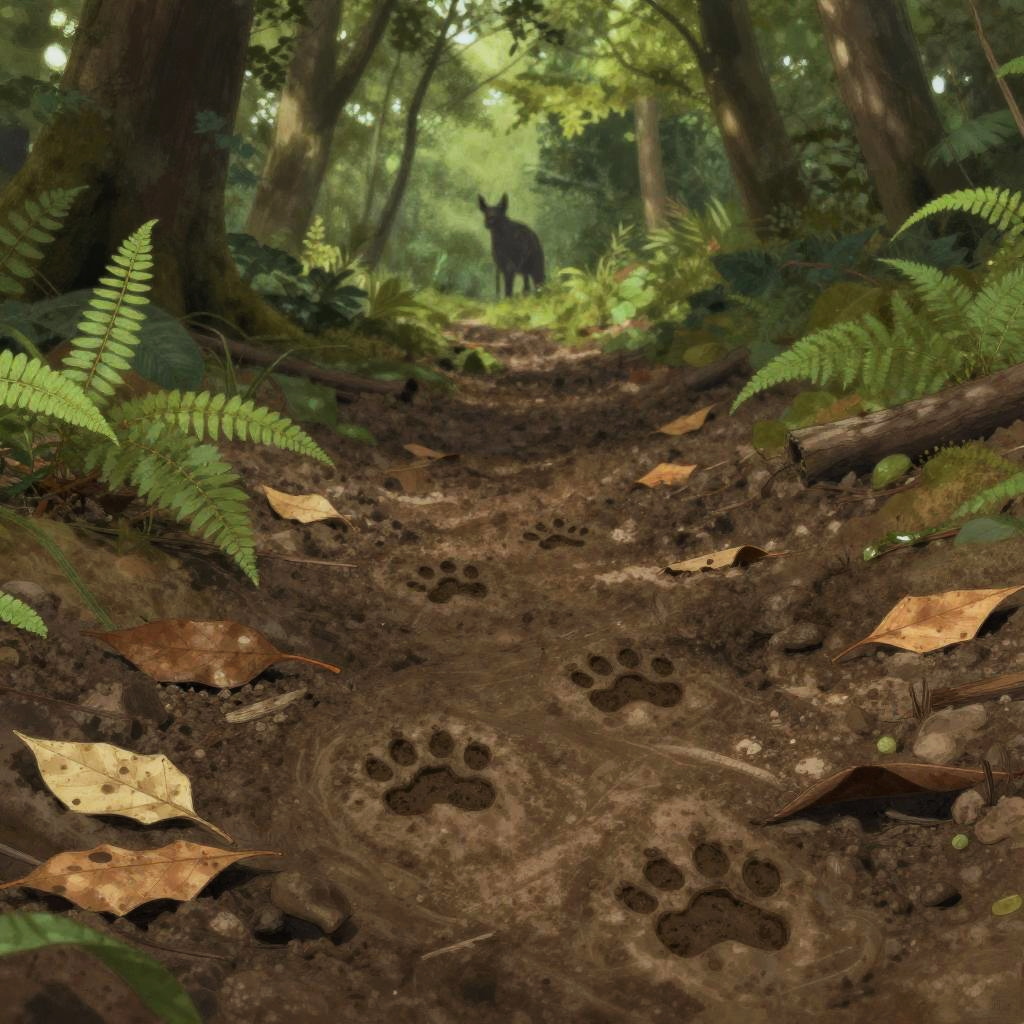 Paws background showing a forest floor covered in muddy paw prints, natural greens and browns, detailed texture of leaves and soil, realistic wildlife illustration