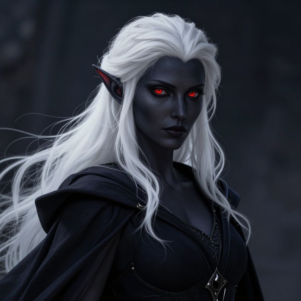 D&D female drow portrait, midnight-skinned elf with sharp features, flowing white hair, piercing red eyes, elegant dark cloak, mysterious background, fantasy illustration, cinematic style