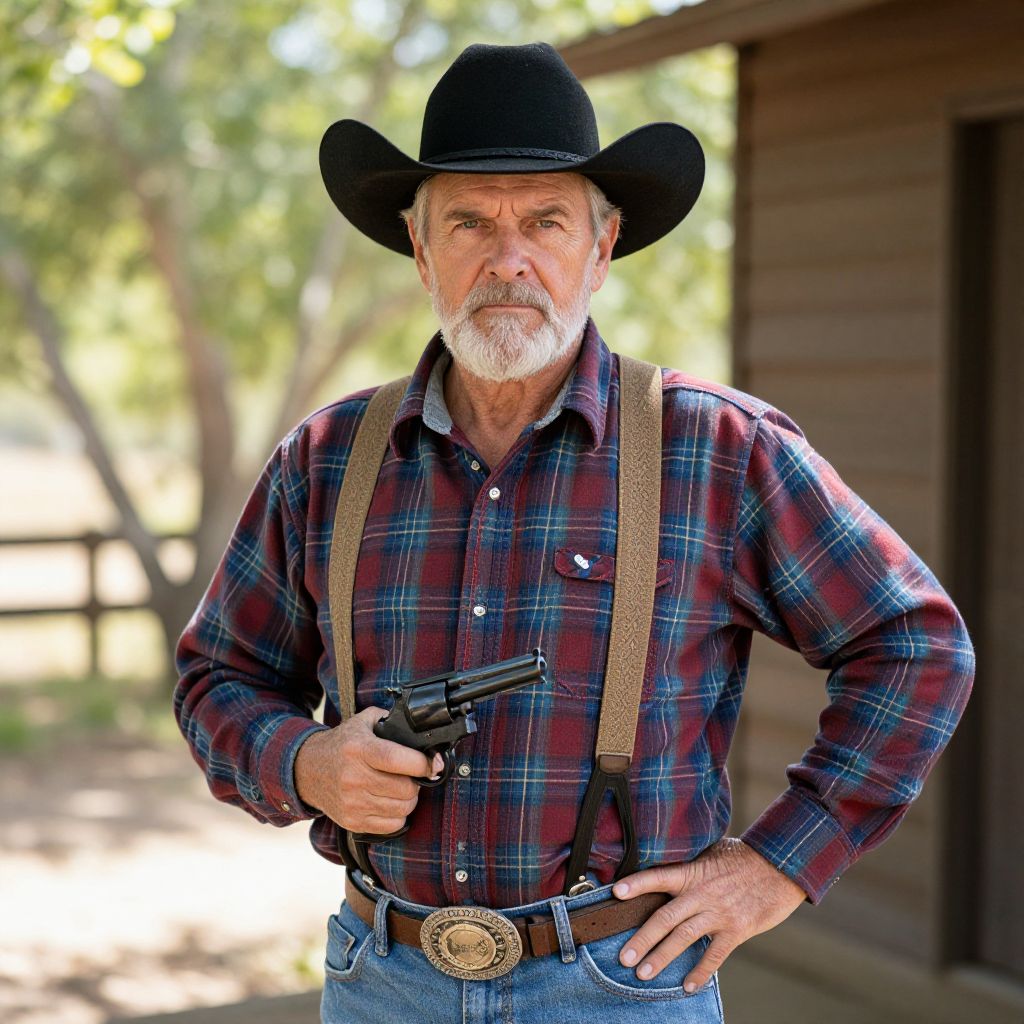 Photograph of an older white man with a white beard and mustache, wearing a black cowboy hat, red and blue plaid shirt, and blue jeans with brown suspenders. He's holding a black revolver in his right hand, with his left hand resting on his waist. The background shows a sunlit outdoor setting with trees and a wooden building. The man looks serious and confident.