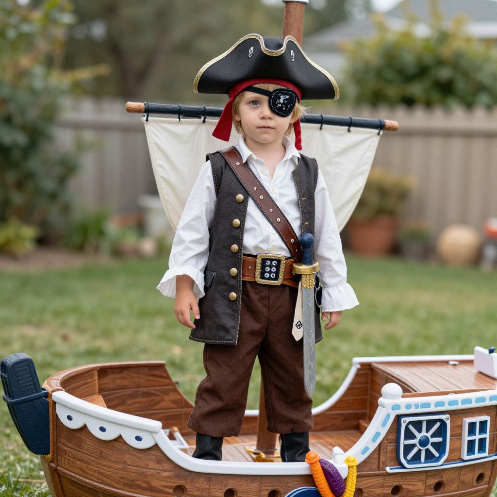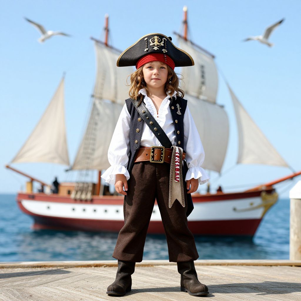 A boy wearing a detailed pirate costume with a frilly shirt, belt, and boots, standing on a dock with a model sailboat in the background, under a clear blue sky with seagulls flying overhead.