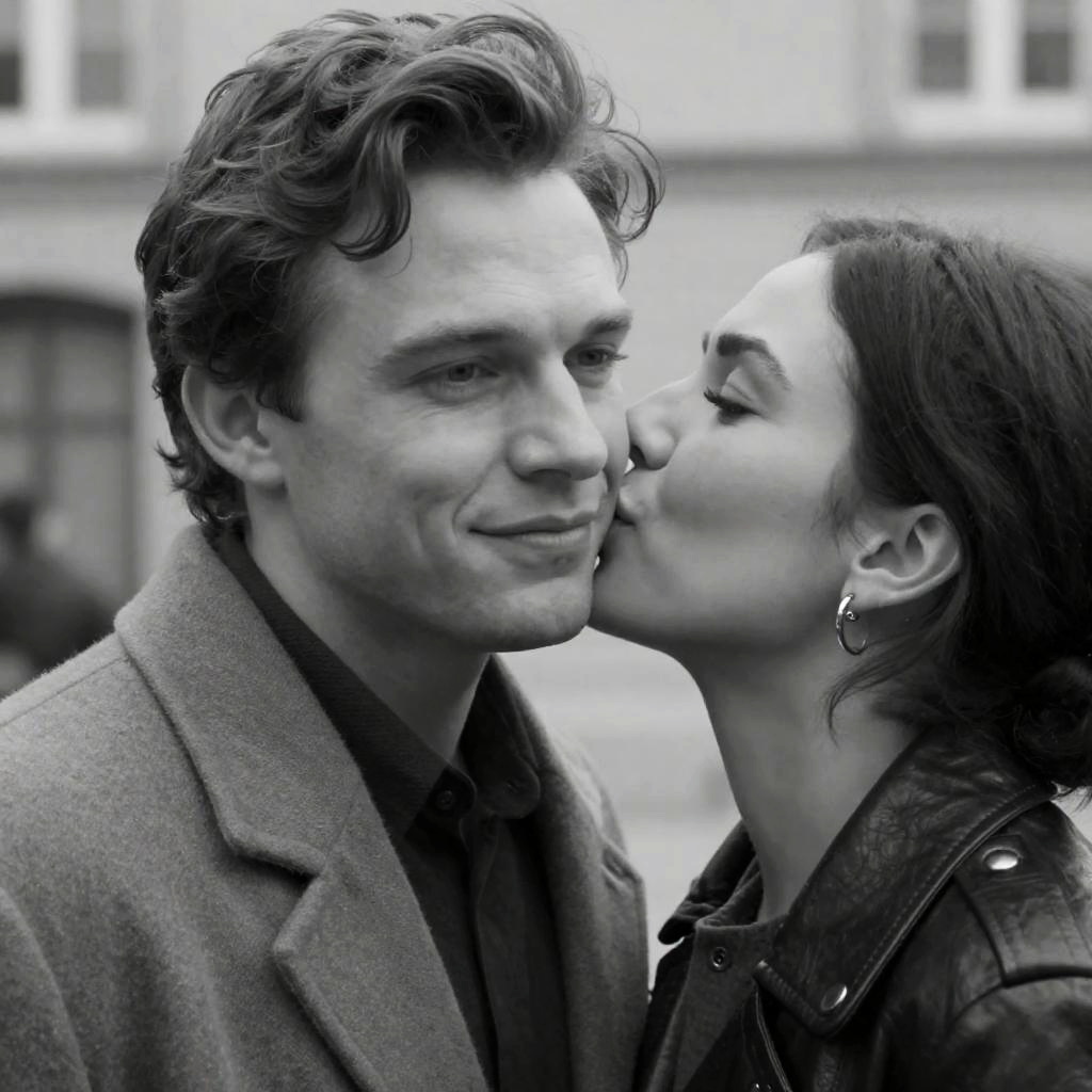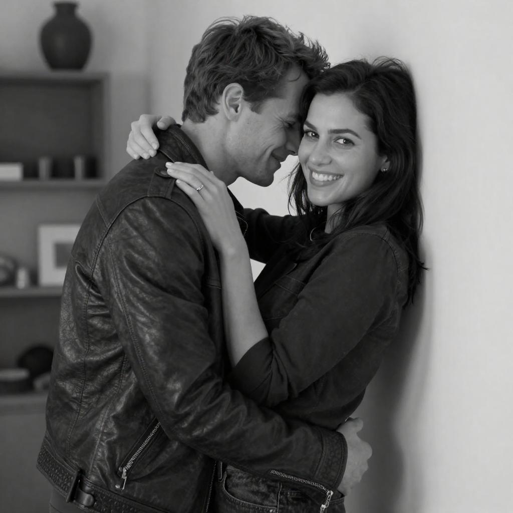 Black-and-white photograph of a man and woman in an intimate embrace. Man with short hair, wearing a leather jacket, holds woman with dark hair, wearing a dark shirt, against a wall. Woman smiles intensely. Background includes shelves and objects.