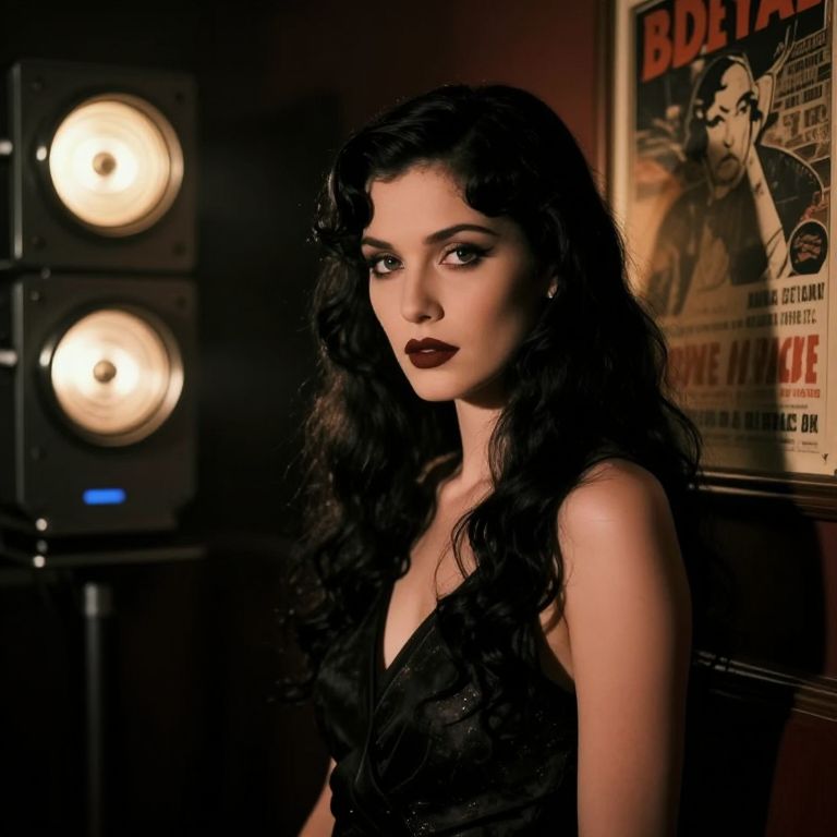 Photograph of a dark-haired woman with voluminous, wavy black hair and deep red lipstick, wearing a black, sleeveless, lace dress with a plunging neckline. She has a pale complexion and striking, dark eyes. The background is dimly lit with a poster on the right featuring a vintage movie advertisement and two large, illuminated studio lights on the left. The setting has a retro, noir vibe with dramatic lighting highlighting her face. Her expression is serious and slightly seductive. The overall image has a moody, vintage cinematic feel.