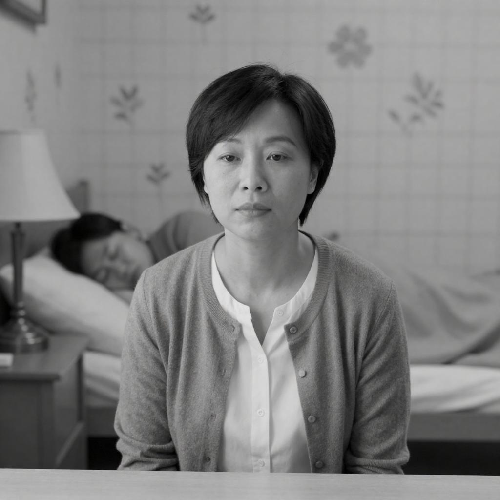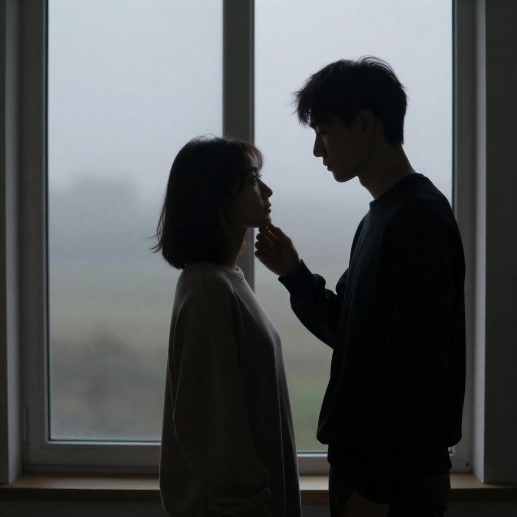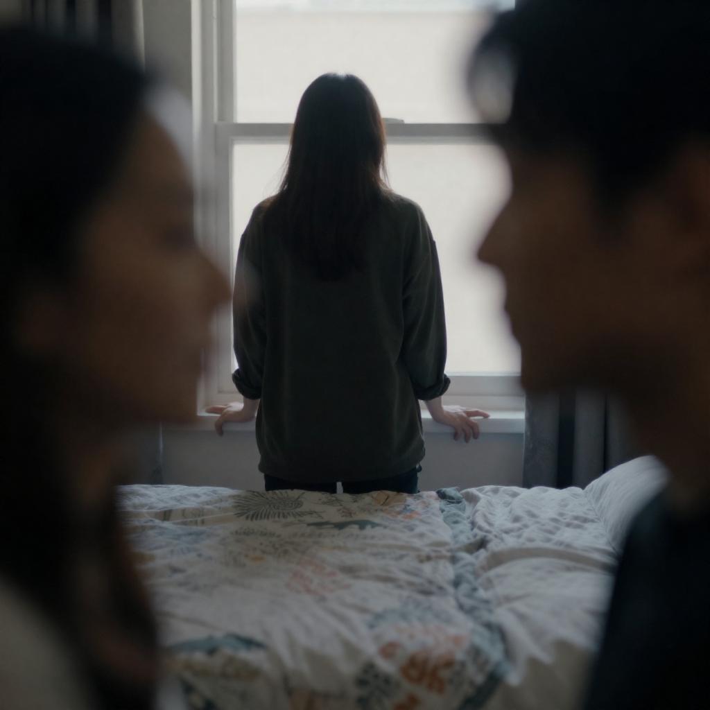 Blurry photograph of two people. Foreground: indistinct, out-of-focus face. Background: person with long hair, facing window, wearing dark jacket, hands on window sill, sunlight through window. Indoor setting, dim light. Objects: bed with patterned blanket.