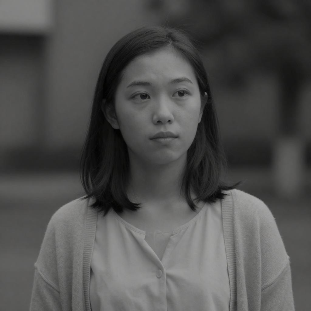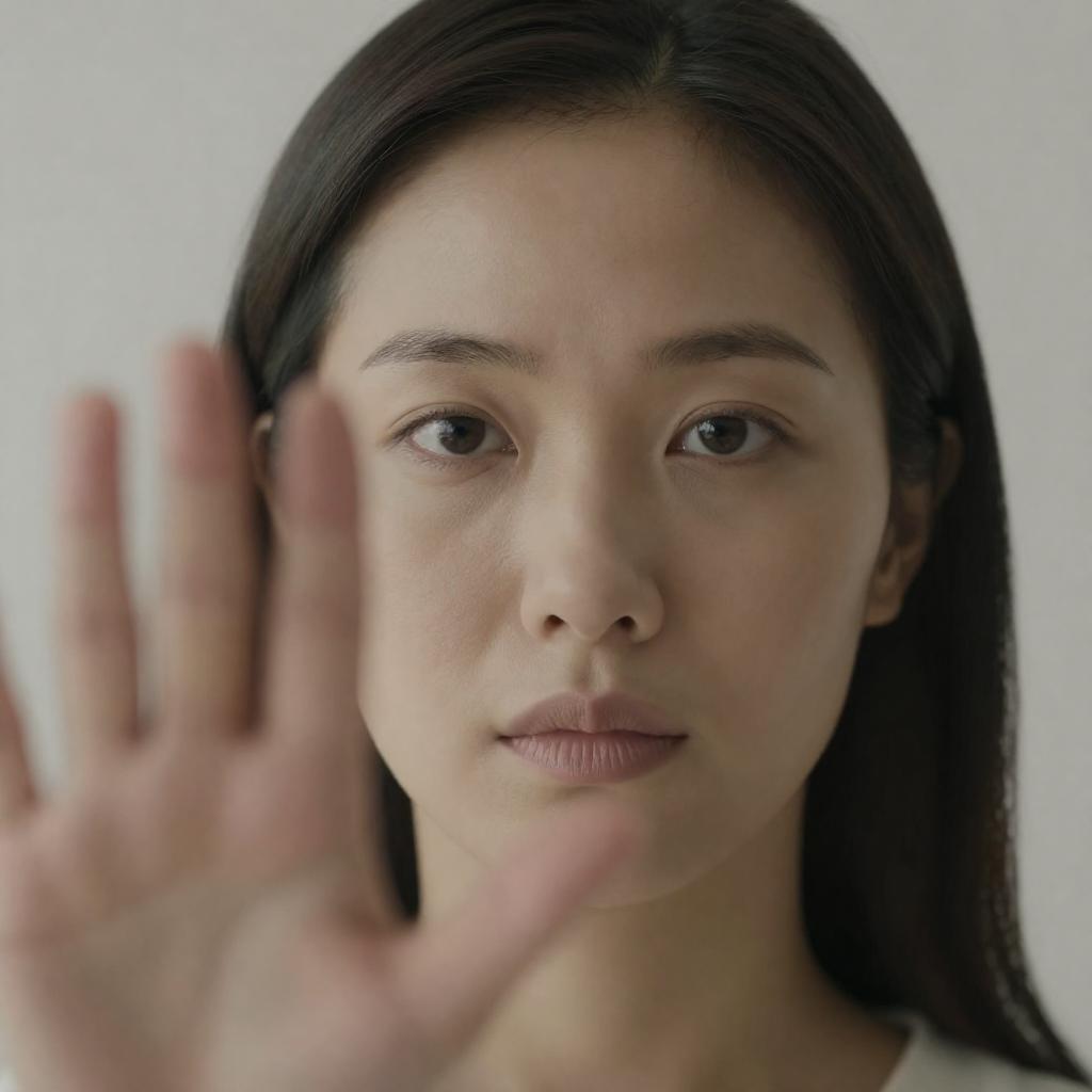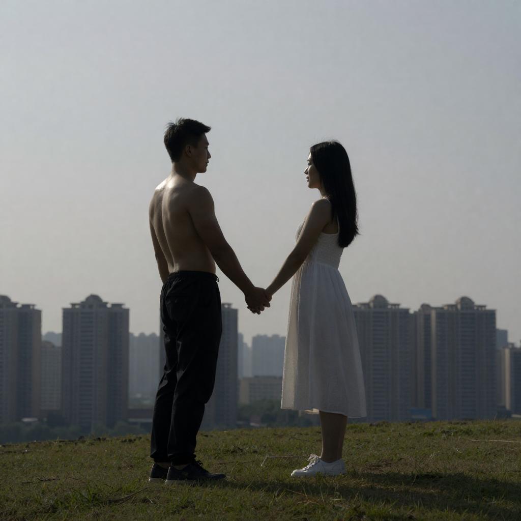 Blurry photograph of two people. Foreground: indistinct, out-of-focus face. Background: person with long hair, facing window, wearing dark jacket, hands on window sill, sunlight through window. Indoor setting, dim light. Objects: bed with patterned blanket.