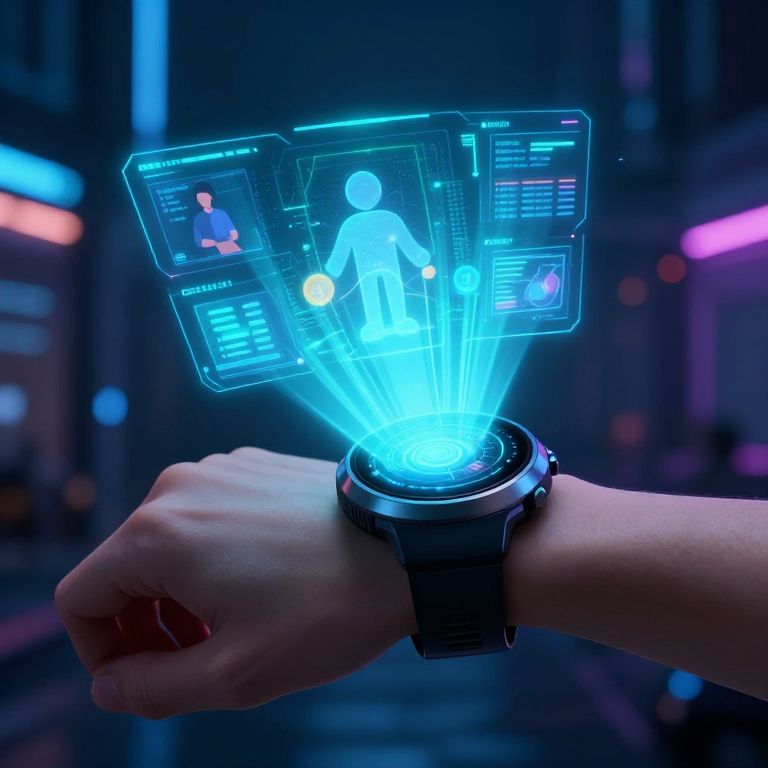 Photograph of a hand wearing a futuristic black smartwatch, projecting holographic blue interface with a human figure and data screens. Neon-lit cityscape