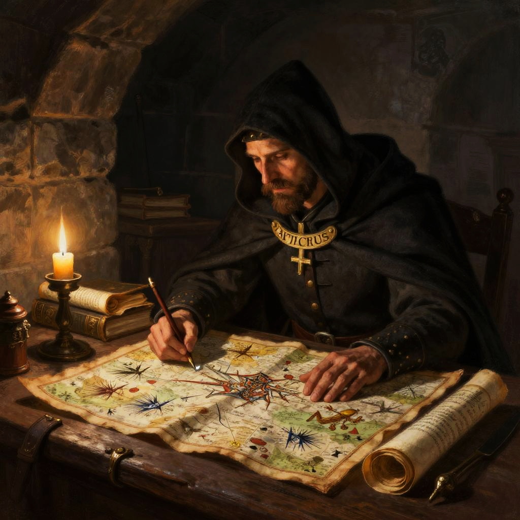 Medieval Strategist Studying Battle Plans