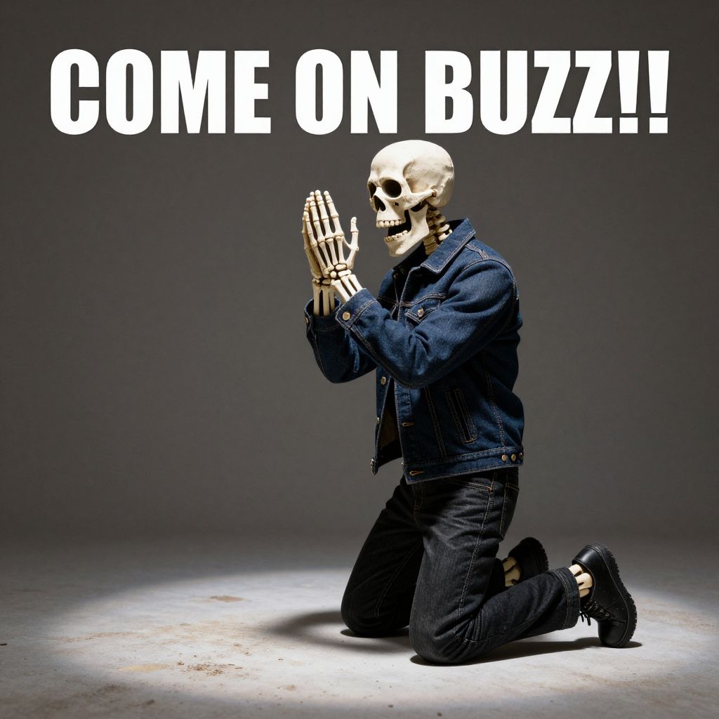 Photograph of a kneeling skeleton in a denim jacket and black pants, praying, with bold white text above saying "COME ON BUZZ!!!" against
