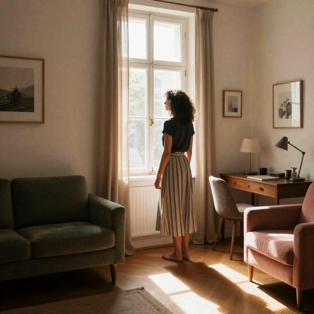 Oval mirror with green-lit border reflecting a dimly lit hallway. Blonde woman in dark clothing, mid-step, moving towards door. Door has glass panels, slightly ajar, showing faint light from outside. Background includes dark furniture and patterned floor.