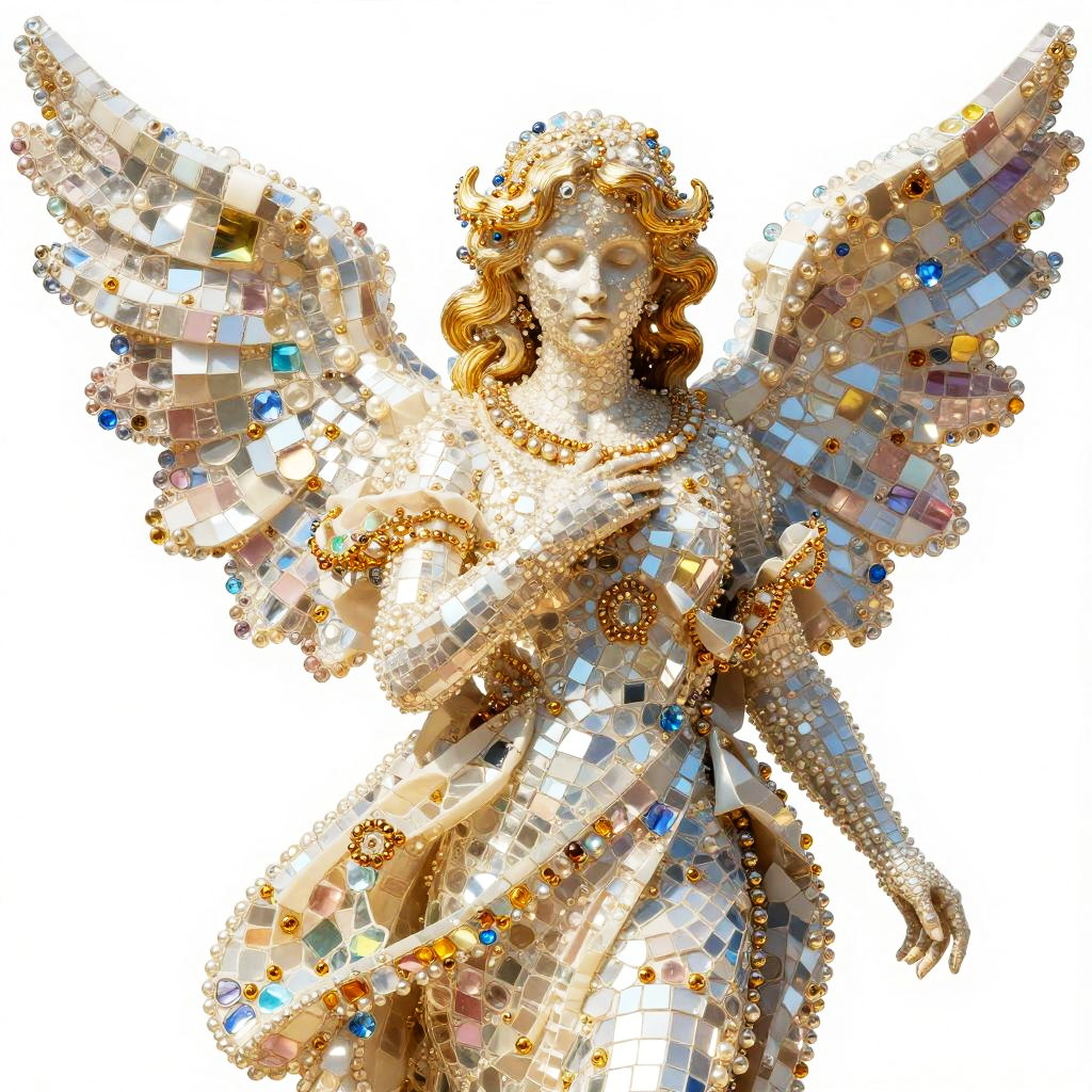 A detailed digital artwork featuring a graceful angel composed of a mosaic of small, colorful glass beads that form a fragmented, pixelated effect. The subject is portrayed in a baroque style, with carefully arranged blocks creating depth and definition. The color palette is vibrant, including shades of pearl white, gold, soft pink, champagne that reflect light, giving the artwork a luminous quality.