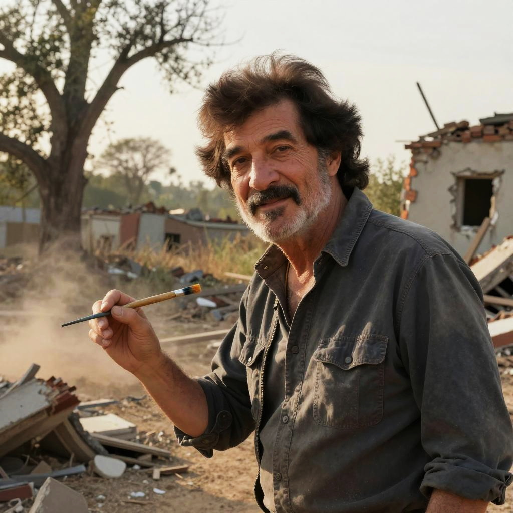 Bob ross war portrait, peaceful artist guiding a war-torn world with his brush, warm light illuminating dust and rubble, delicate strokes creating trees among ruins, subtle expressions of resilience and melancholy, rich color palette combining warmth and gray