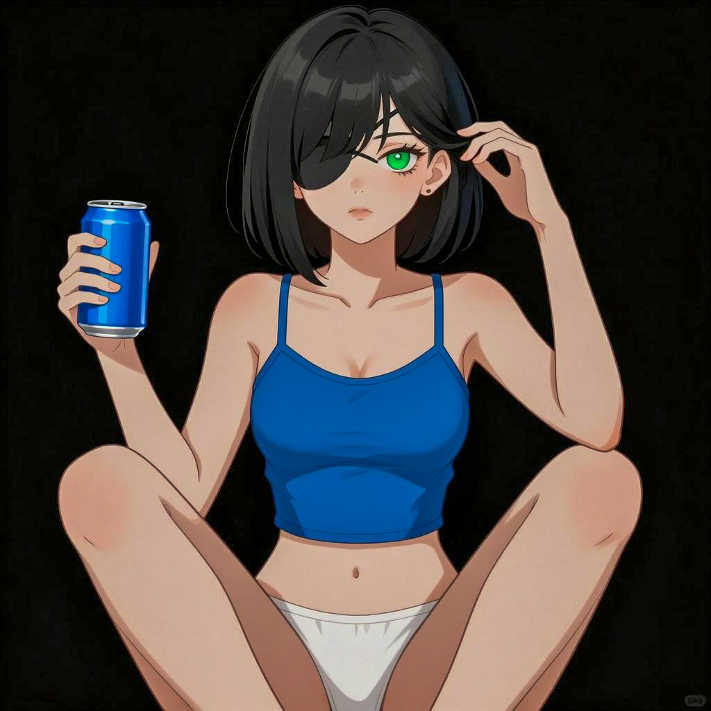 CGI illustration of a sexy woman with short black hair, green eye, and eyepatch. She wears a tight blue tank top and white panties, holding a blue soda can in her right hand. Her left hand touches her hair. She has a cute, serious expression. She's seated against a black background. The tank top hugs her large breasts. Her skin is pale. She's centered in the image, with a slight tilt to her body. One person.