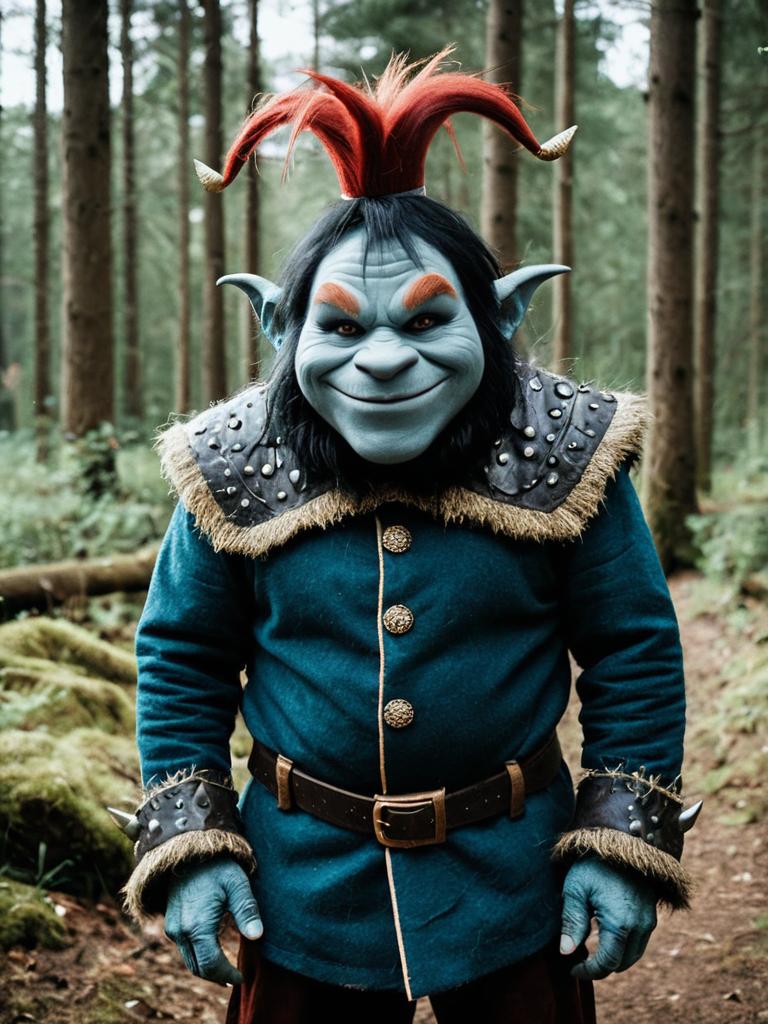 Man in King Gristle Trolls Costume, photorealistic outdoor portrait with forest backdrop