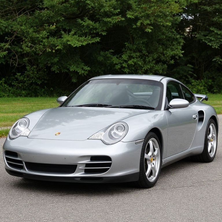 Photograph of a sleek, silver Porsche 911 sports car parked on a gray asphalt road. The car has a polished, reflective surface and features distinctive rounded headlights, a black front grille, and silver alloy wheels with visible yellow brake calipers. The windows are tinted, and the roof is a matching silver color. The background consists of lush, green trees and a grassy lawn, providing a natural contrast to the car's metallic sheen. The lighting is natural, highlighting the car's contours and smooth lines.