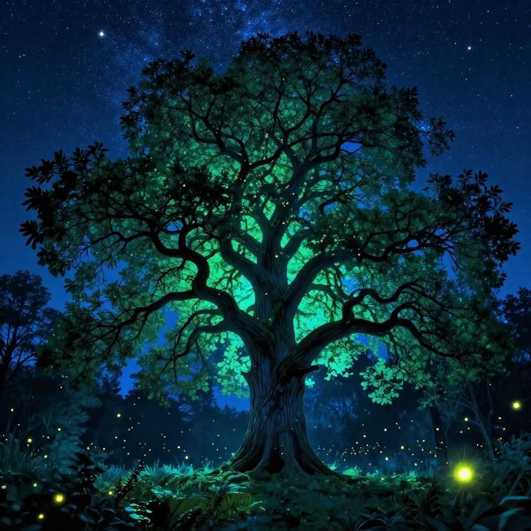 Majestic Eiche tree with sprawling branches under a starry night sky, glowing fireflies fluttering around, ethereal blue and green hues, enchanted forest ambiance, dreamy and magical concept art with high detail and vivid colors.