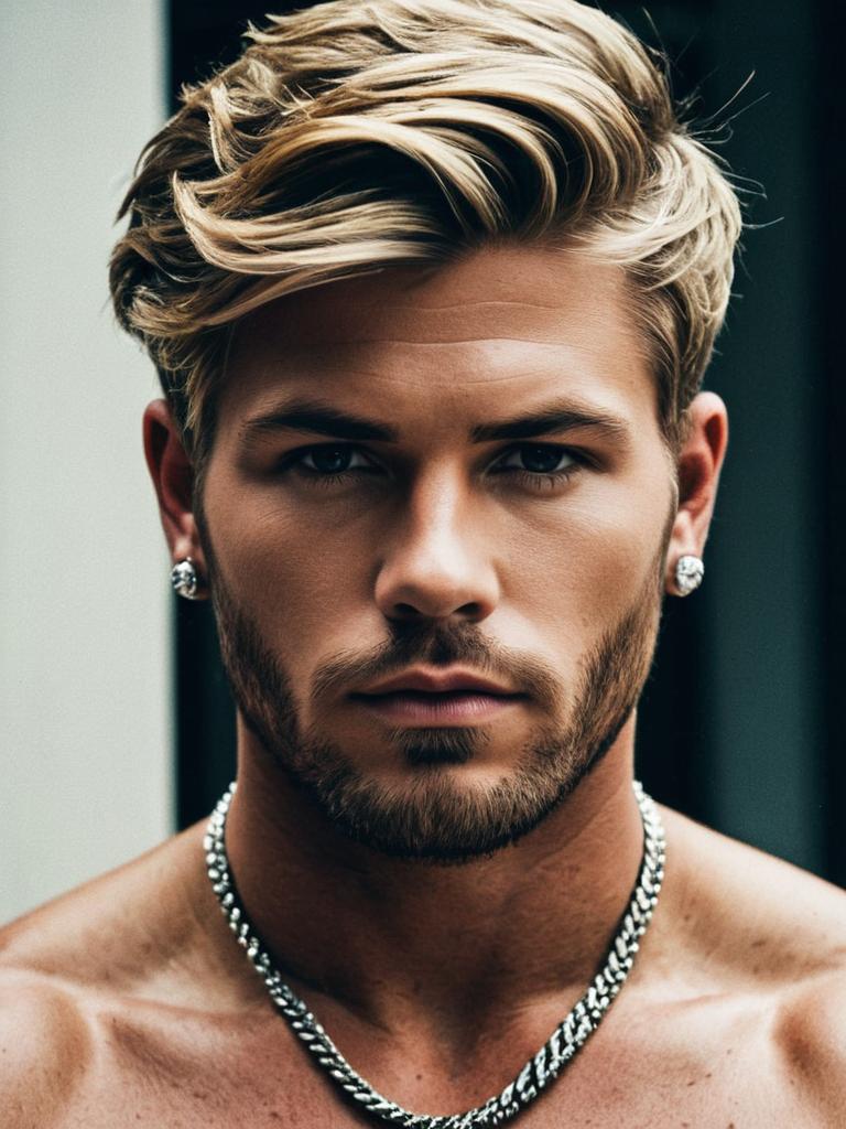 Close-up portrait of a handsome young man with styled blonde hair and facial hair. He is wearing silver earrings and a thick silver chain necklace. The image focuses on his well-groomed beard and intense gaze, highlighting a modern hairstyle and masculine accessories against a blurred background.