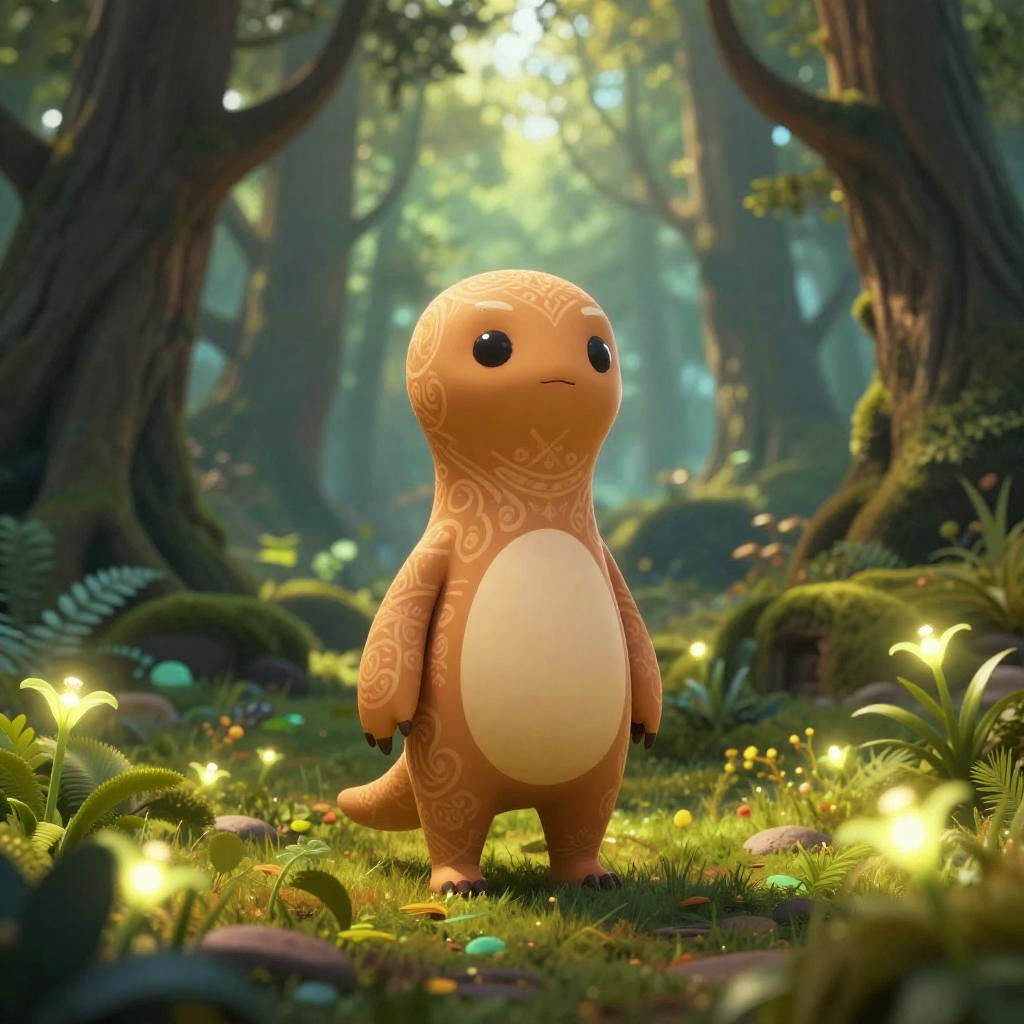 A stylized soykack character standing in a mystical forest with glowing plants, soft ethereal light filtering through tall ancient trees, intricate patterns on the creature’s skin, fantasy art style, rich colors