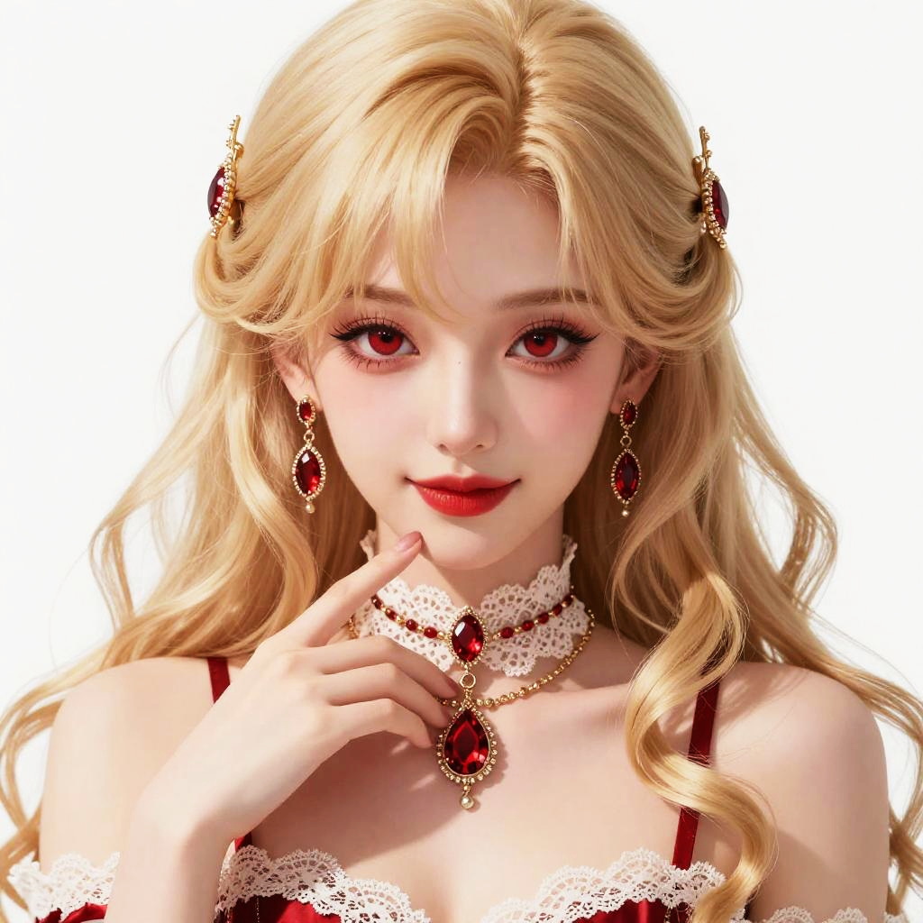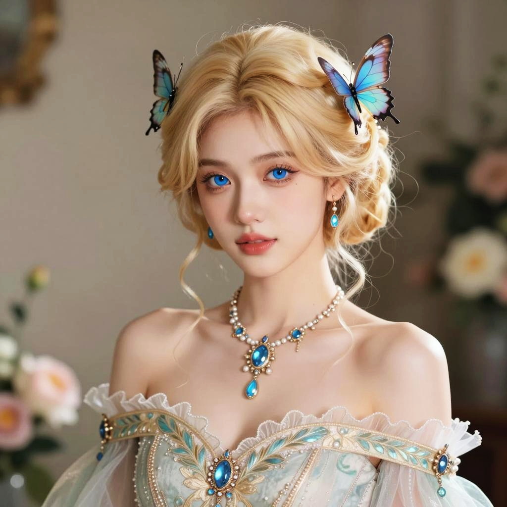 This digital artwork portrays a striking young woman with vibrant blue eyes and elegantly styled blonde hair adorned with delicate butterfly accessories. She wears an intricately designed, off-shoulder gown with detailed embroidery and a matching exquisite necklace, set against a softly blurred floral background. The image features a refined fantasy art style with realistic yet stylized elements emphasizing beauty and grace.